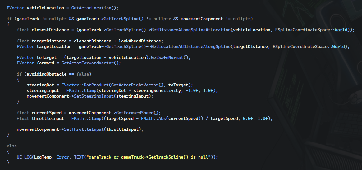 All of this code is simply telling the AI "Hey, spline is there go follow its path". The "avoidingObstacle" if check is there so that the AI can override the steering of the spline following in the case of an obstacle being in the way so it can steer away from the obstacle. Without that if check the AI will only focus on following the spline with no regard for the obstacles in its path. I also had to completely get rid of the "AutoSuccessRangeFromLastSeenLocation" variable from my sightConfig in my AI controller as that was making the AI unable to stop seeing the obstacles it passed which prevented it from hitting the code that was written to stop overriding the steering. With these three issues solved, the final result is what you see in the video below!
