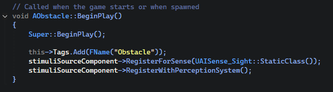 The "stimuliSourceComponent" is simply a component needed on objects that want to be seen by the AI perception system as without it and the proper setup in BeginPlay the AI will not see the object at all. After you have that set up I just had to check in my AI controller's perception handling if what it saw was tagged with the "Obstacle" tag, if it was sensed, and if it was get the direction of the obstacle so it can turn away from it, and once the obstacle is out of range it will go back to following the spline. The second issue was much more time consuming and took a lot more math which is getting the AI to follow the spline.